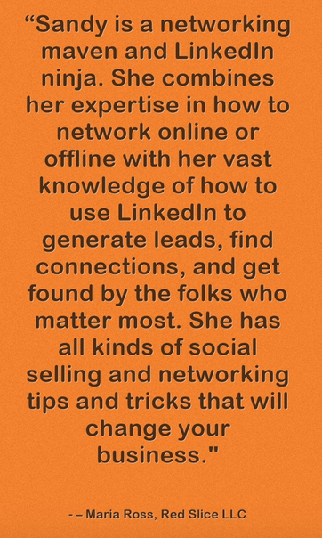 Sandy is a powerful connector and a strong speaker. She has command of her topic (networking), and is engaging, informative, and to the point but in a warm and friendly fashion with great stories and case studies. Authenticity and integrity are her touchstones, and she encourages others to be themselves and relax about networking. Sandy’s a real breath of fresh air! - Kelli Richards, CEO, The All Access Group